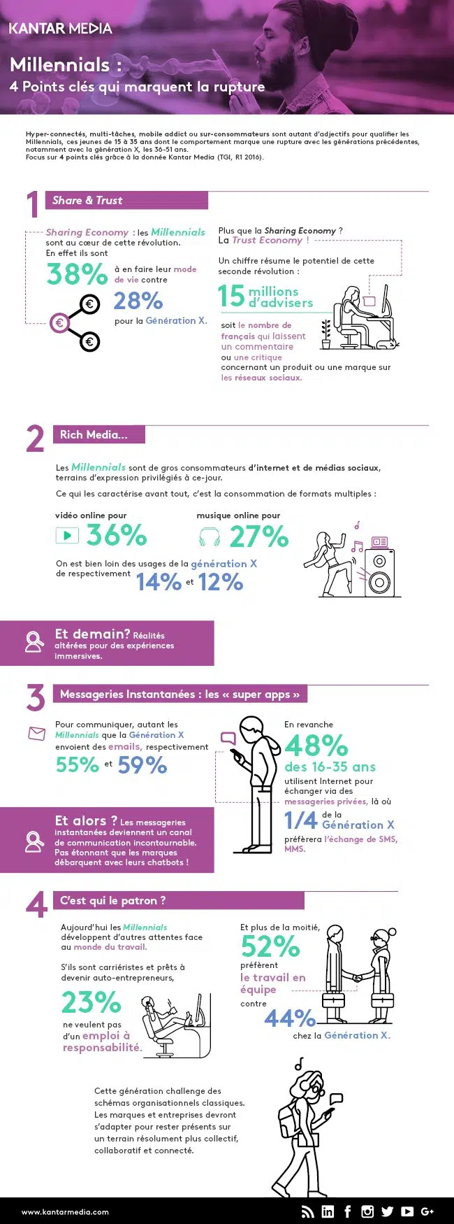 Hyper-connectés, multi-tâches, mobile addict ou sur-consommateurs sont autant d’adjectifs pour qualifier les Millenials, ces jeunes de 15 à 35 ans dont le comportement marque une rupture avec les générations précédentes, notamment avec la Génération X, les 36-51 ans.